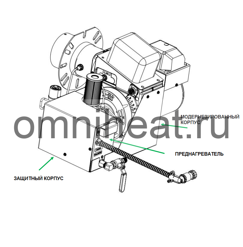Подогреватель модернизированной версии монтируется непосредственно на корпус горелки, а не на сам котел. Он устанавливается на металлический листовой кронштейн, поставляемый в комплекте модернизации